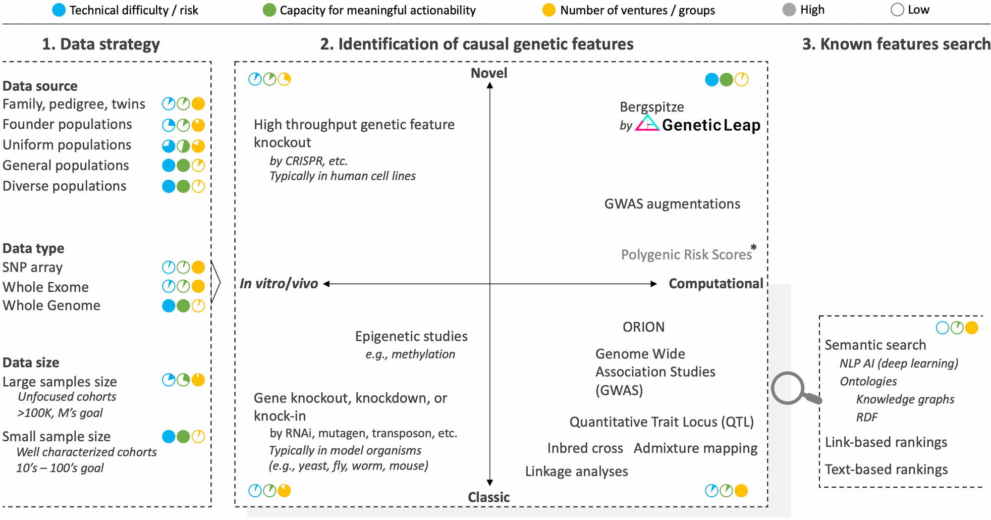 There are many approaches and nuances to consider, which can be classified into three segments: 1) data strategy, 2) identification of causal genetic features, and 3) search and match of known genetic features. The component strategies of these segments are summarized graphically in the figure below along with approximate scores rating technical risk, overall capacity for meaningful actionability and the number of ventures pursuing the strategy.