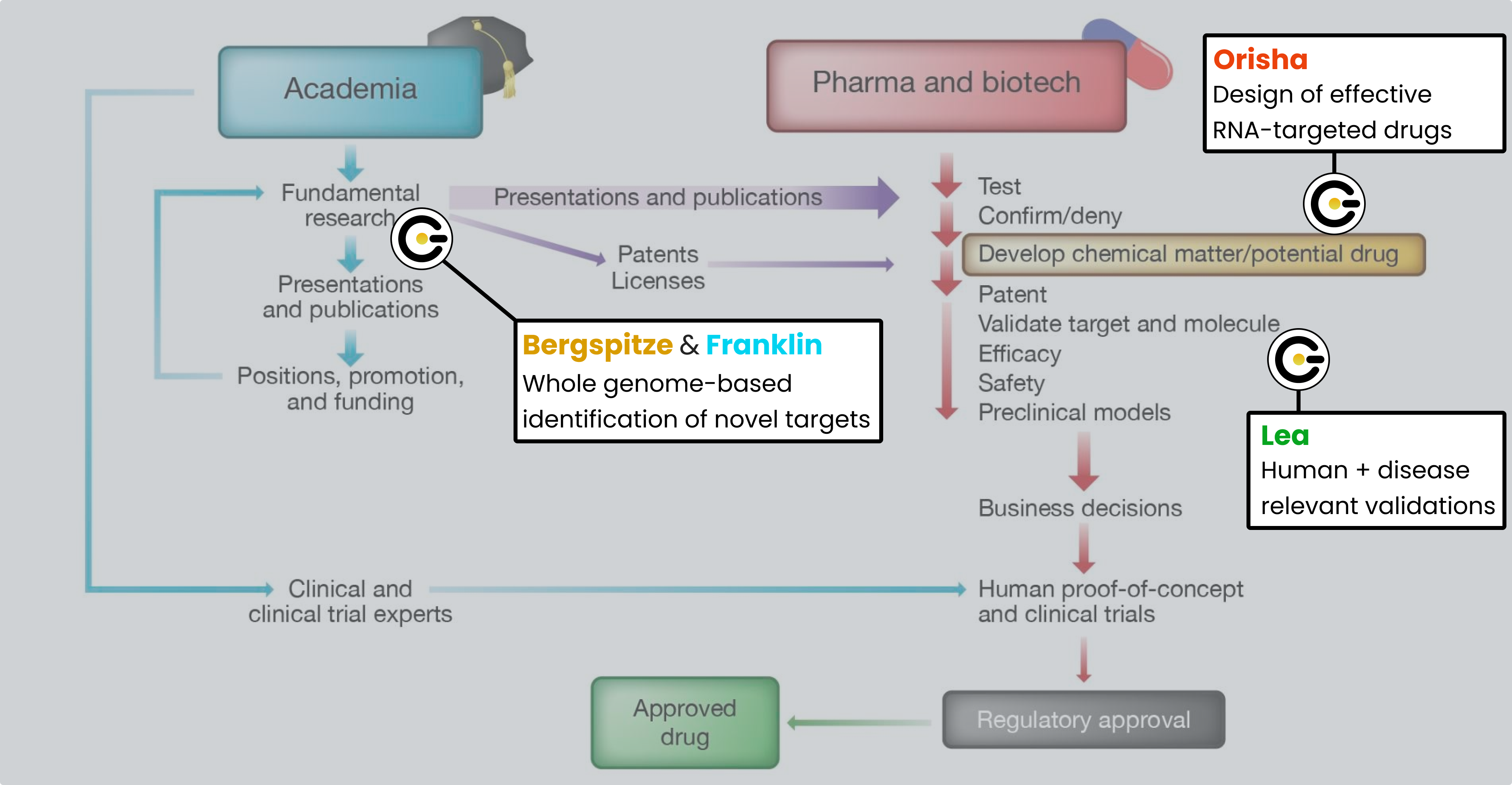 The crucial rate limiting step of drug discovery is coming up with the genetic explanation (or disease mechanism) and thus predictive model for a cure. This process is typically left up to academic labs who, with funding from federal agencies and after years of toil, would provide a predictive model for a disease including potential targets. The pharmaceutical industry then takes it from there and enterprises to develop therapeutic modalities against the targets identified by academic groups.
